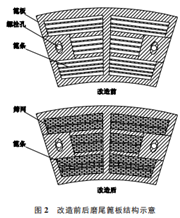 上述解決出料篦板堵塞的措施只能起到緩解出料篦板的堵塞、延長出料篦板的清理周期的作用,不能從根本上徹底解決問題。因此,還需對球磨機出料篦板的結(jié)構(gòu)進行改造。通過利用現(xiàn)有材料自制防堵塞篦板,降低堵塞影響,增大磨尾通風面積,解決飽磨問題。改造前后磨尾篦板結(jié)構(gòu)示意見圖2。