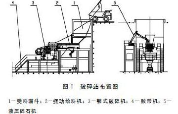 破碎物為鐵礦石,原礦粒度0~1000mm,產(chǎn)品粒度0~300mm,松散密度2.15t/m³。為方便移設(shè),設(shè)計采用半移動破碎站,主要工藝設(shè)備為破碎機和給礦設(shè)備。根據(jù)礦石分布的地理環(huán)境、原礦及產(chǎn)品的特點,首期在兩個不同位置布置了兩個型式相同的破碎站,每個破碎站設(shè)計能力450萬t/a;破碎機采用紅星機器生產(chǎn)的顎式破碎機,給料設(shè)備采用紅星機器生產(chǎn)的振動給料機。為了處理超大塊礦石,每個破碎站配置了一臺液壓碎石機。破碎站布置如圖1。